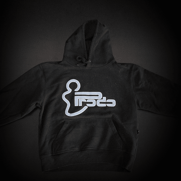 Musta Prodo-huppari ei ehkä kesällä ole kaikista kevyin asuste, mutta syksyllä, talvella ja keväällä se pitää varmasti kehon lämpimänä. Hupparissa on reilun kokoinen huppu ja etutasku vatsan kohdalla. Rintamuksesta löytyy tyylitelty potkuhahmo ja teksti “Prodo”.