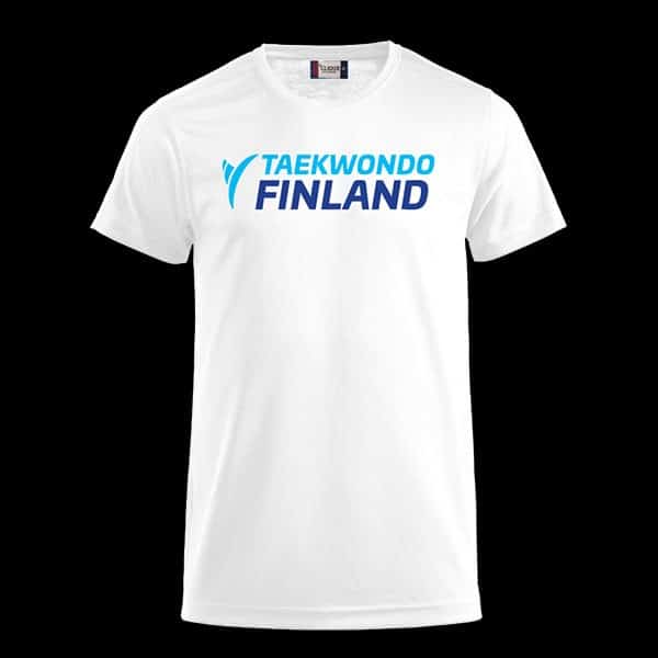 Virallinen Taekwondo Finland tekninen T-paita aikuisille ja laspille. Tuote saatavilla valkoisena ja sinisenä.